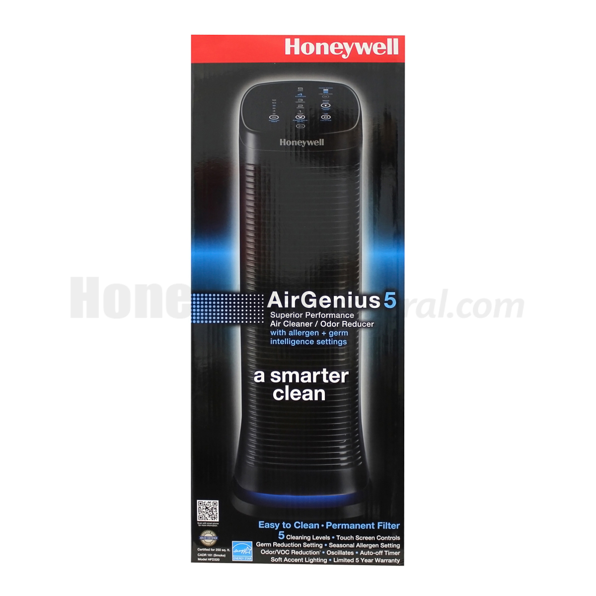 The Energy Star-rated Honeywell/Kaz AirGenius 5 Air Cleaner and Odor Remover, model HFD-320, captures up to 99.9% of ultra fine particles as small as 0.3 microns, including smoke, dust, pollen, mold spores and pet dander. Also included are two prefilters, one permanent and one odor reducing, allowing the machine to freshen your air and reduce certain VOCs and airborne gases. The stylish HFD-310 offers a space-saving tower design and accent lighting with three settings. It's contemporary iPhone® style control panel makes it easy to use and features 5 cleaning levels, a 2-12 hour timer, and an electronic indicator to tell you when to clean the filter. (The filters are permanent and never need replacing; you can clean them by rinsing them in water!)