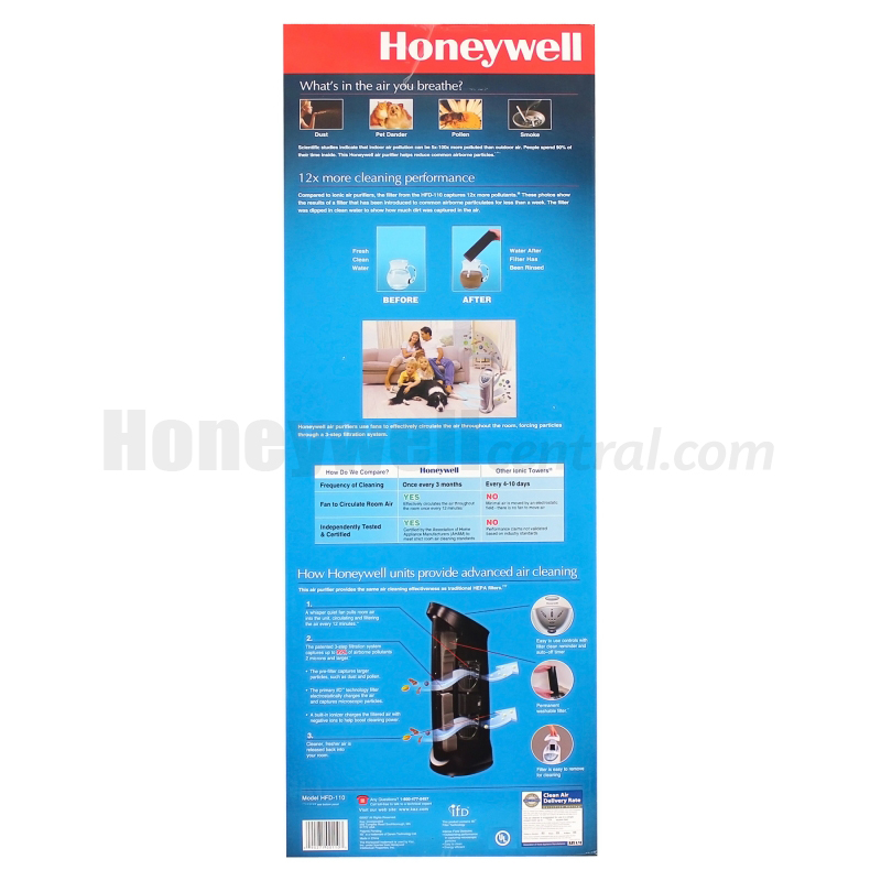 The Energy Star-rated Honeywell/Kaz QuietClean® Tower Air Purifier, model HFD-110, captures up to 99% of ultra fine particles like smoke, dust, pollen, mold spores and pet dander. It's easy to use, with 3 speeds, a 4/8/12 hour timer, and an electronic indicator that tells you when to clean the filter. (The filters are permanent and never need replacing; you can clean them by rinsing them in water!)
