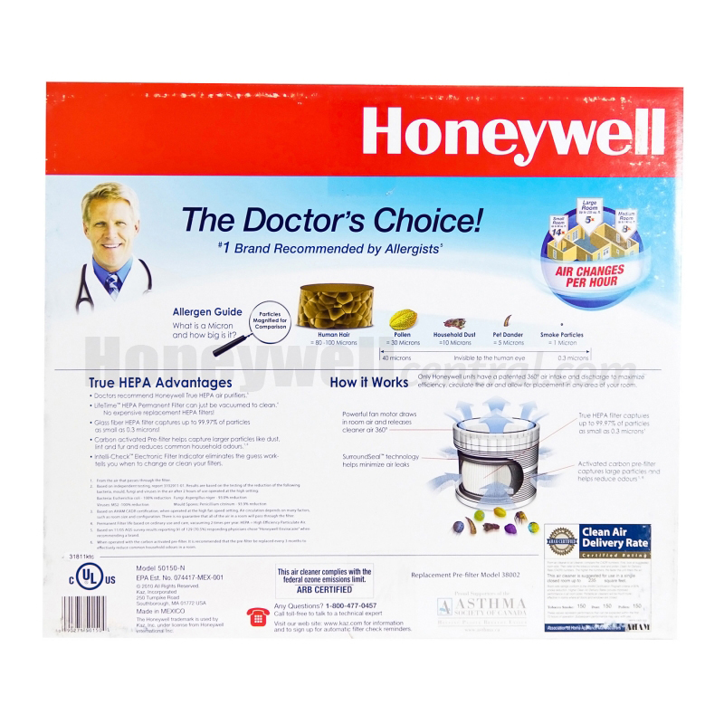 Model # 50150 - Honeywell ® True HEPA Round Air Purifier - True HEPA filter helps remove 99.97% of all airborne particles from the air passing through it such as: pollen, pet dander, household dust, tobacco smoke and mold spores. The activated carbon prefilter helps reduce odors. This unit has a Patented 360 degree air intake and discharge and 3 speeds. The Intelli-Check ™ feature electronically monitors filter usage and this technology was the #1 Choice of Physicians (1998 Riter Research). 5 Year Limited Warranty. Recommended Room Size 15 x 15 feet.