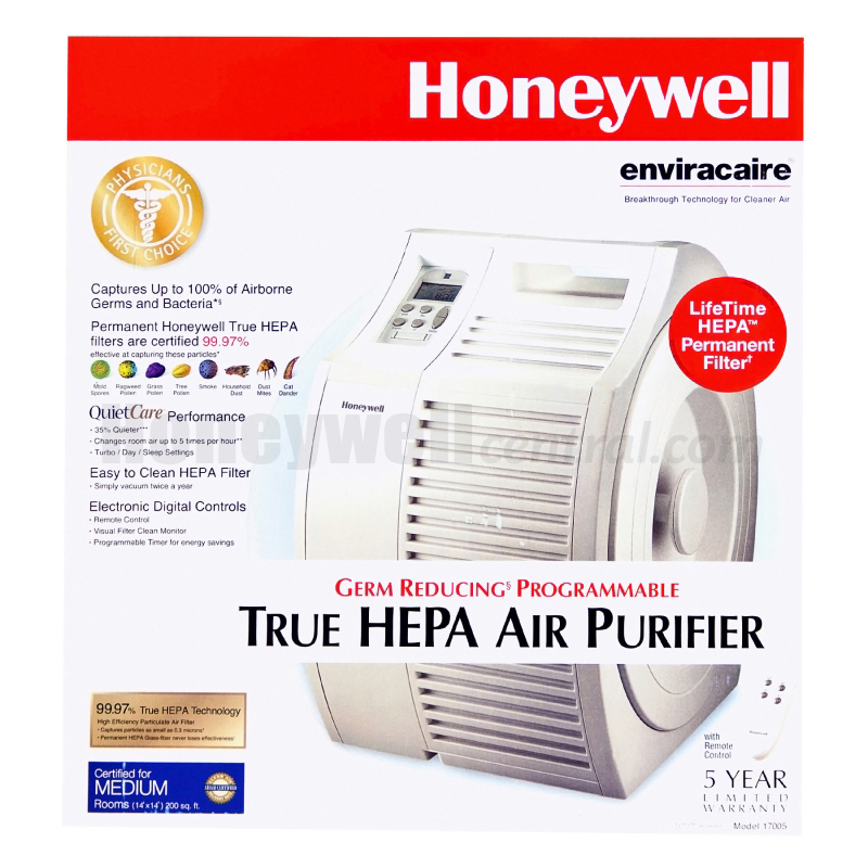 17005 5 year limited warranty. The Intelli-Check ™ feature electronically monitors filter usage and there is easy filter access for convenient replacement. 97% minimum effectiveness at capturing airborne particles, as small as 0. This unit has a Remote Control for added convenience and uses a True HEPA filter which has 99. Recommended Room Size 12 x 14 feet. Model # 17005 - Honeywell Quiet Care ™ Ultra Quiet Programmable HEPA Air Cleaner with Remote Control - QuietCare ™ incorporates patented airflow technology with sound reducing features for ultra quiet high speed operation. The 17005 is programmable operations and 3 Air Cleaning levels. 3 microns, from the air that passes through it.