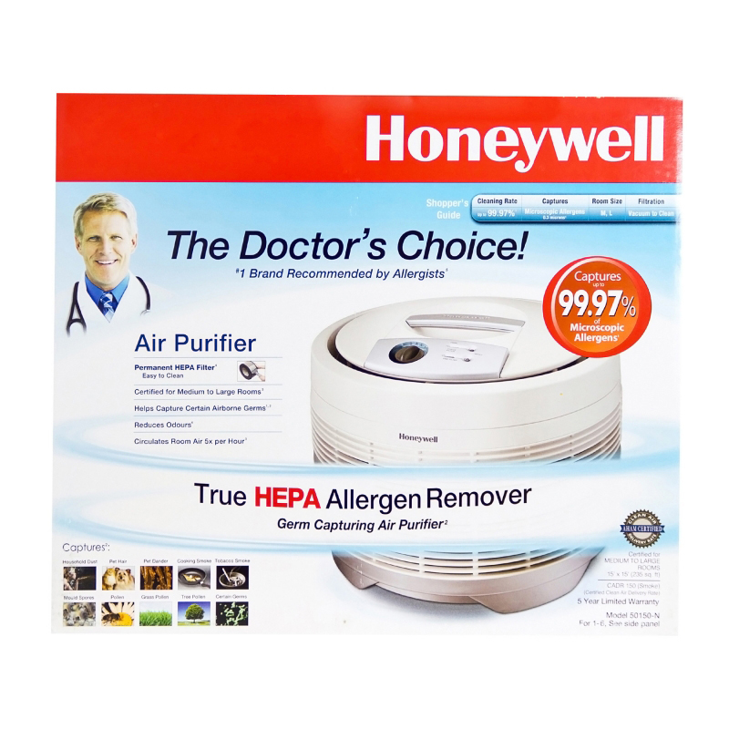 50150 5 Year Limited Warranty. This unit has a Patented 360 degree air intake and discharge and 3 speeds. Model # 50150 - Honeywell ® True HEPA Round Air Purifier - True HEPA filter helps remove 99. Recommended Room Size 15 x 15 feet.