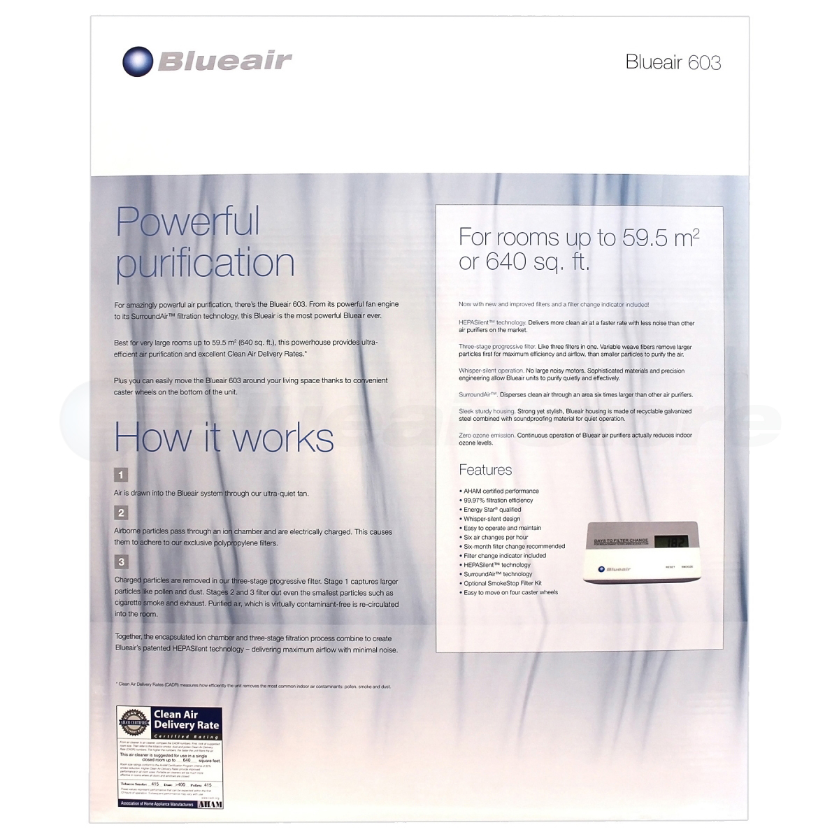 Value-adding features include quiet operation, low energy use, galvanized steel construction, a 5-year warranty, and a convenient Change Filter Indicator that reminds you to change your filters every six months. The NEW Blueair 603 Air Purifier delivers more clean air at a faster rate with less noise. 1 micron particles on speed one, including allergy-provoking pollen, dust mites, mold spores and pet dander.