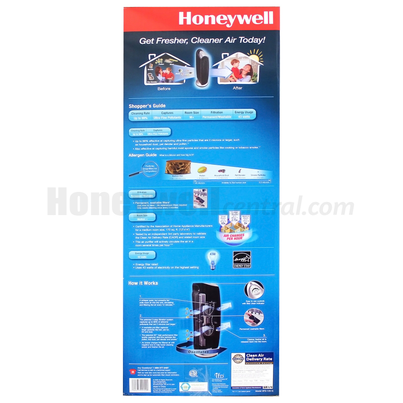 The QuietClean air purifier is whisper-quiet, and features optional oscillation. The Energy Star-rated Honeywell/Kaz QuietClean® Tower Air Purifier, model HFD-120-Q, captures up to 99% of ultra fine particles like smoke, dust, pollen, mold spores and pet dander.