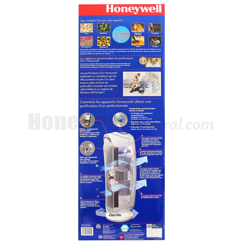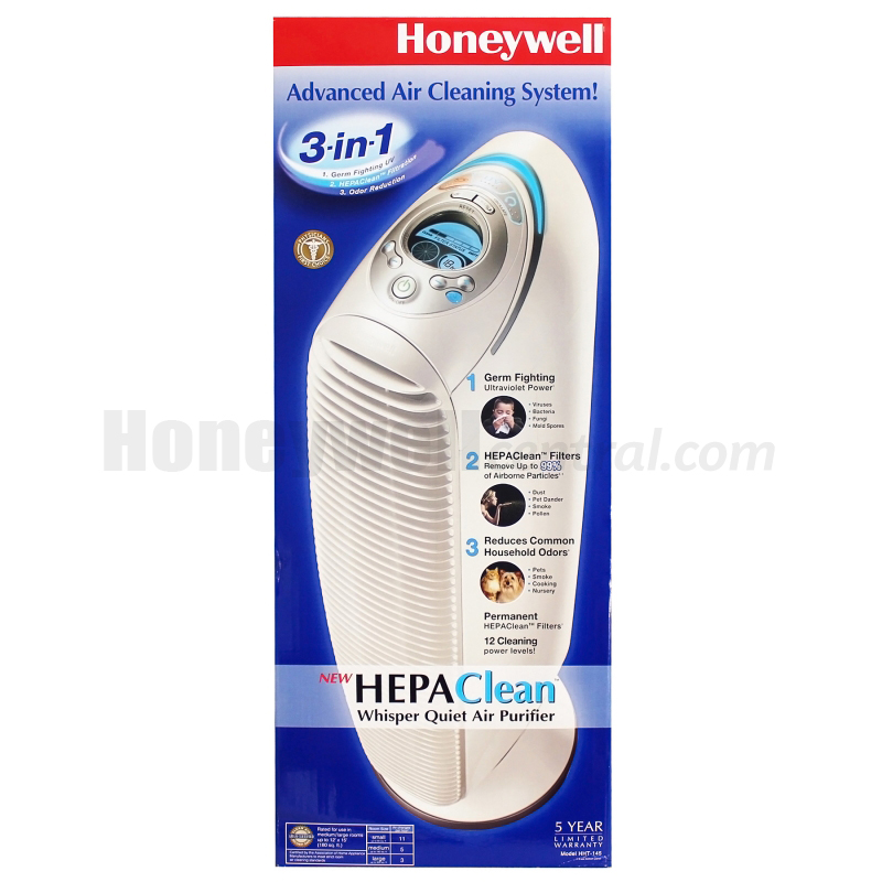The feature-packed HHT-145 air purifier has advanced electronic controls, 12 cleaning levels, a 1-18 hour timer, a filter-clean indicator, an optional ionizer and oscillation. Next, the HEPAClean filter captures up to 99% of fine airborne particles such as dust, pollen, smoke, mold spores & pet dander. The Honeywell/Kaz HEPAClean® 3-in-1 Tower Air Purifer, model HHT-145, incorporates three levels of protection to help keep your air healthy!