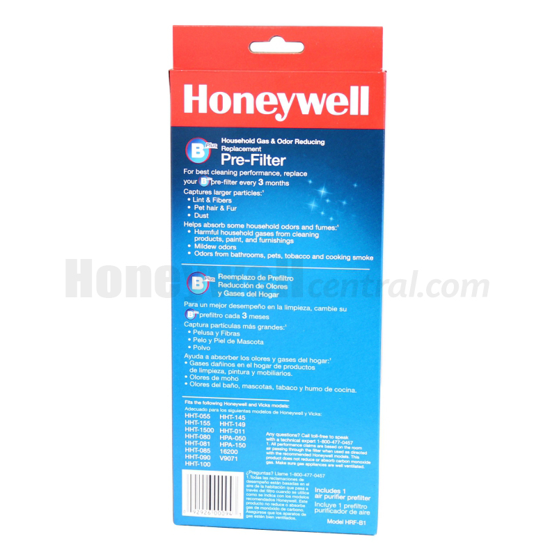 HRF-B1 For optimal performance, replace the HRF-B1 filter every 3 months. It helps absorb some common household gases and fumes. The Honeywell/Kaz Household Odor & Gas Reducing Pre-filter, model HRF-B1, uses activated carbon and zeolite to capture odors and freshen the air. It's also a particle filter, designed to capture larger particles like dust, lint, and pet fur.