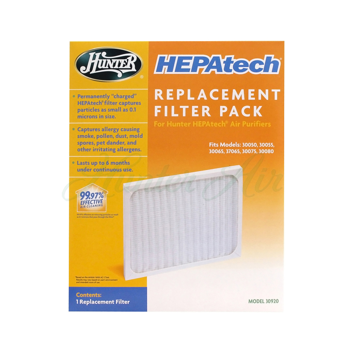 Hunter HEPAtech™ - Replacement Filter 30920 HEPAtech Filters are permanently charged electrostatic filters that effectively capture 99. 97% of particles as small as 0. Through six months of continuous use, this filter removes such contaminants as smoke, pollen, dust, mold spores, pet dander, and allergens. 1 micron in size. This filter features a white cardboard frame with white HEPAtech material on its front and black carbon to help remove odors on the back. For the best performance, replace your filter every 6 months.