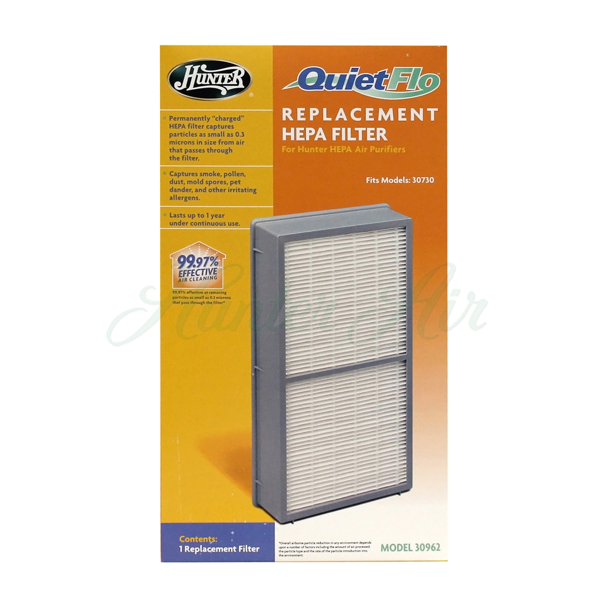 QuietFlo™ - Replacement Filter 30962 Hunter QuietFlo True HEPA filters effectively capture 99. For the best performance, replace your filter every 12 months. 97% of all airborne particles as small as 0. 3 microns in size.